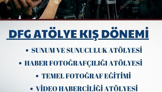 Dicle Fırat Gazeteciler Derneği’nin genç muhabirler ve mesleğe yeni başlayanlara dönük düzenlediği atölyelerin kış dönemi başlıyor. DFG Atölye Kış Dönemi’nde bu yıl, “Sunum ve sunuculuk”, “Diksiyon”, “Fotoğraf Haberciliği Atölyesi”, “Temel Fotoğraf Atölyesi”, “Video Haberciliği Atölyesi” ve “Temel Kamera-Kurgu” başlıklarında eğitimler verilecek.