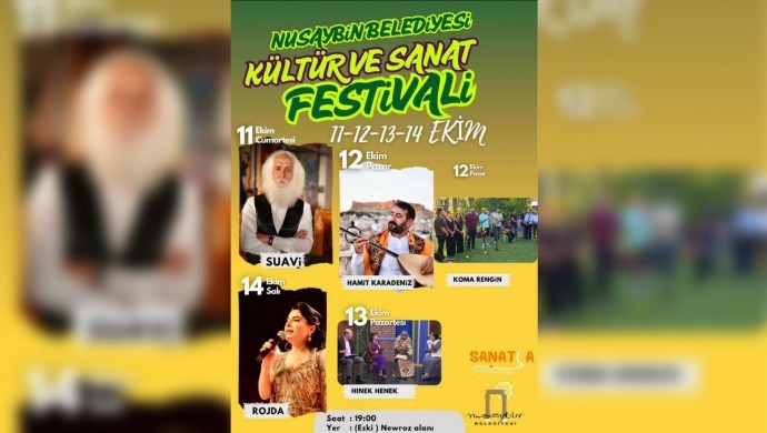 Mardin’in Nusaybin Belediyesi, 11-14 Ekim tarihleri arasında “Kültür ve Sanat Festivali” düzenleyecek. Eski Newroz alanında yapılacak ve 4 gün sürecek festival, 11 Ekim’de festival sanatçı Suavi’nin sahne alması ile başlayacak. Festivalin ikinci gününde ise Hamit Karadeniz ve Koma Rengin sahne alacak. 13 Ekim’de ise Hinek Henek ekibi gösterimi olacak. 14 Ekim’de sanatçı Rojda’nın sahne almasıyla festival son bulacak.